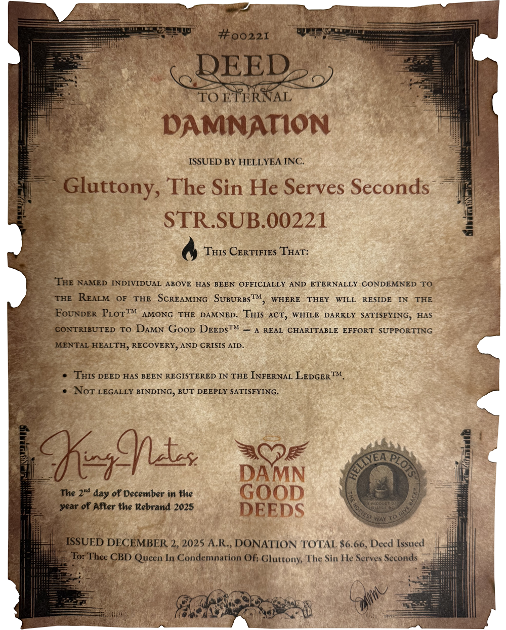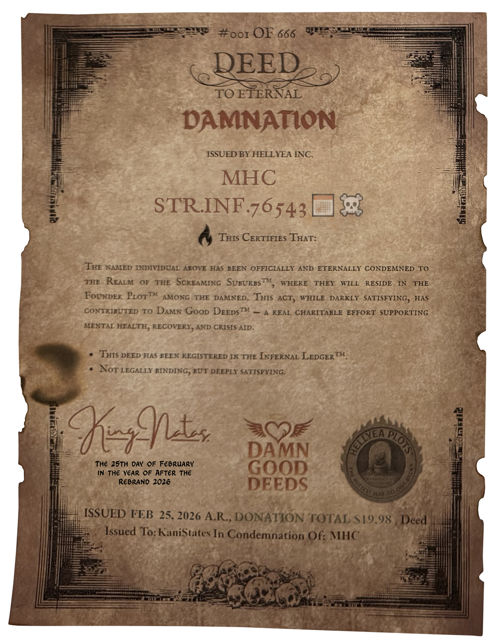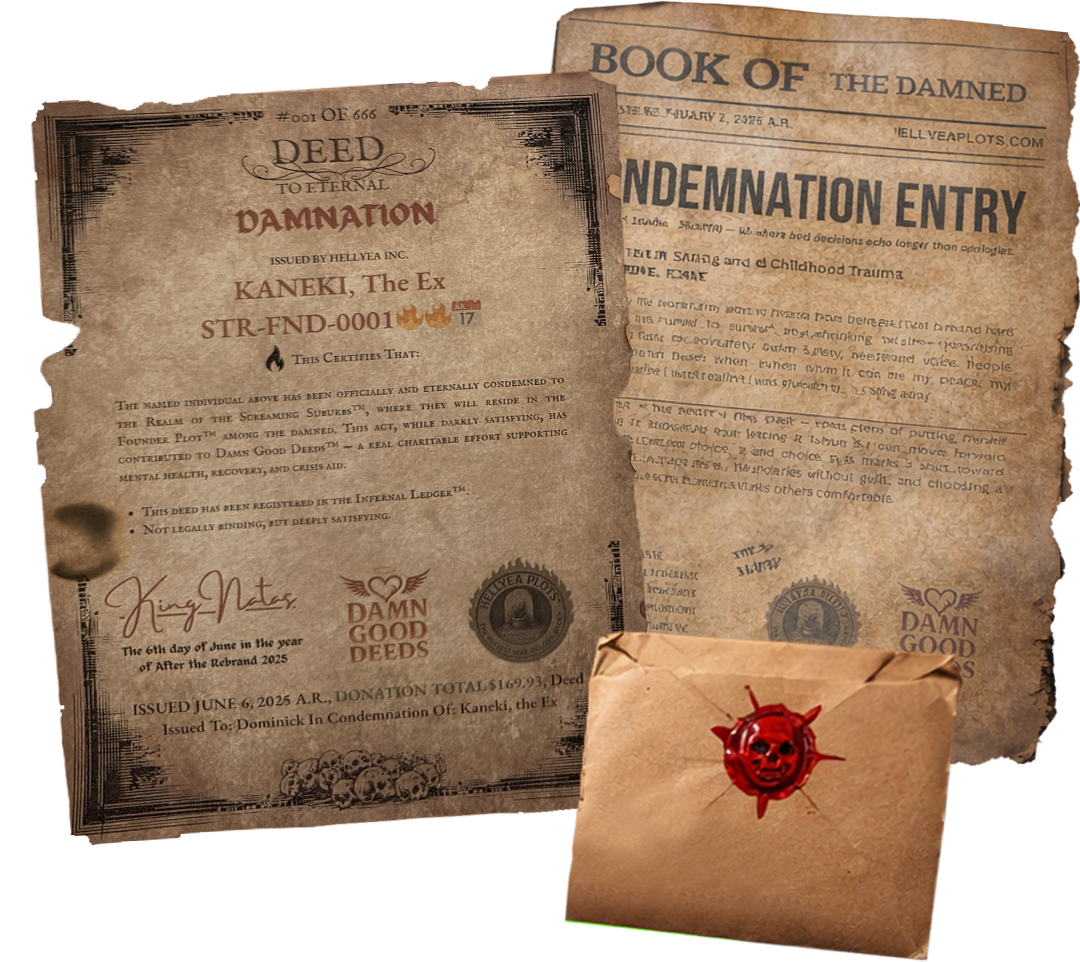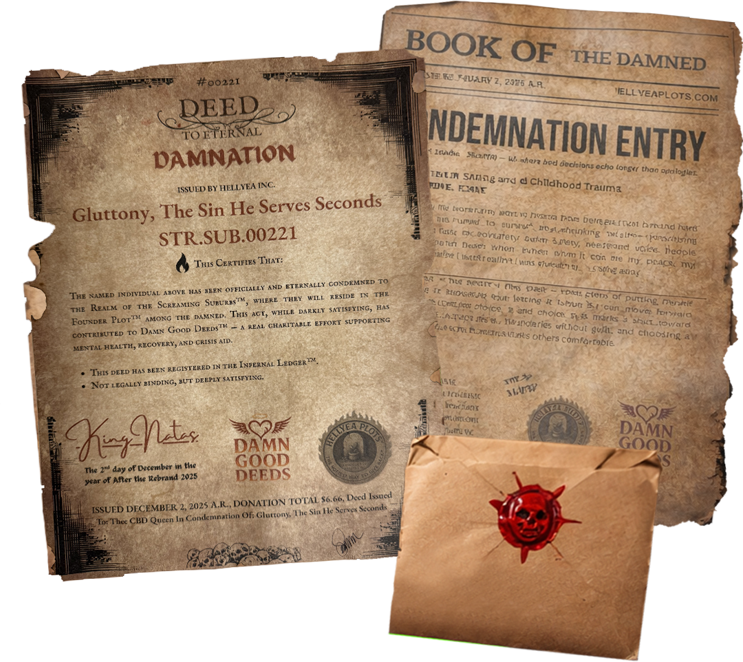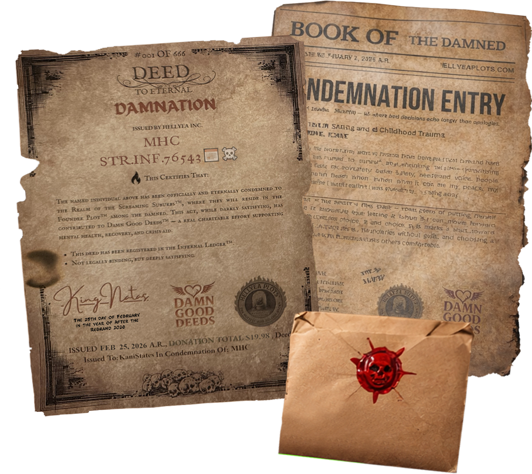 Get an Official Deed Packet mailed to you and your name in the Infernal Ledger™ — each purchase funds mental-health charities.